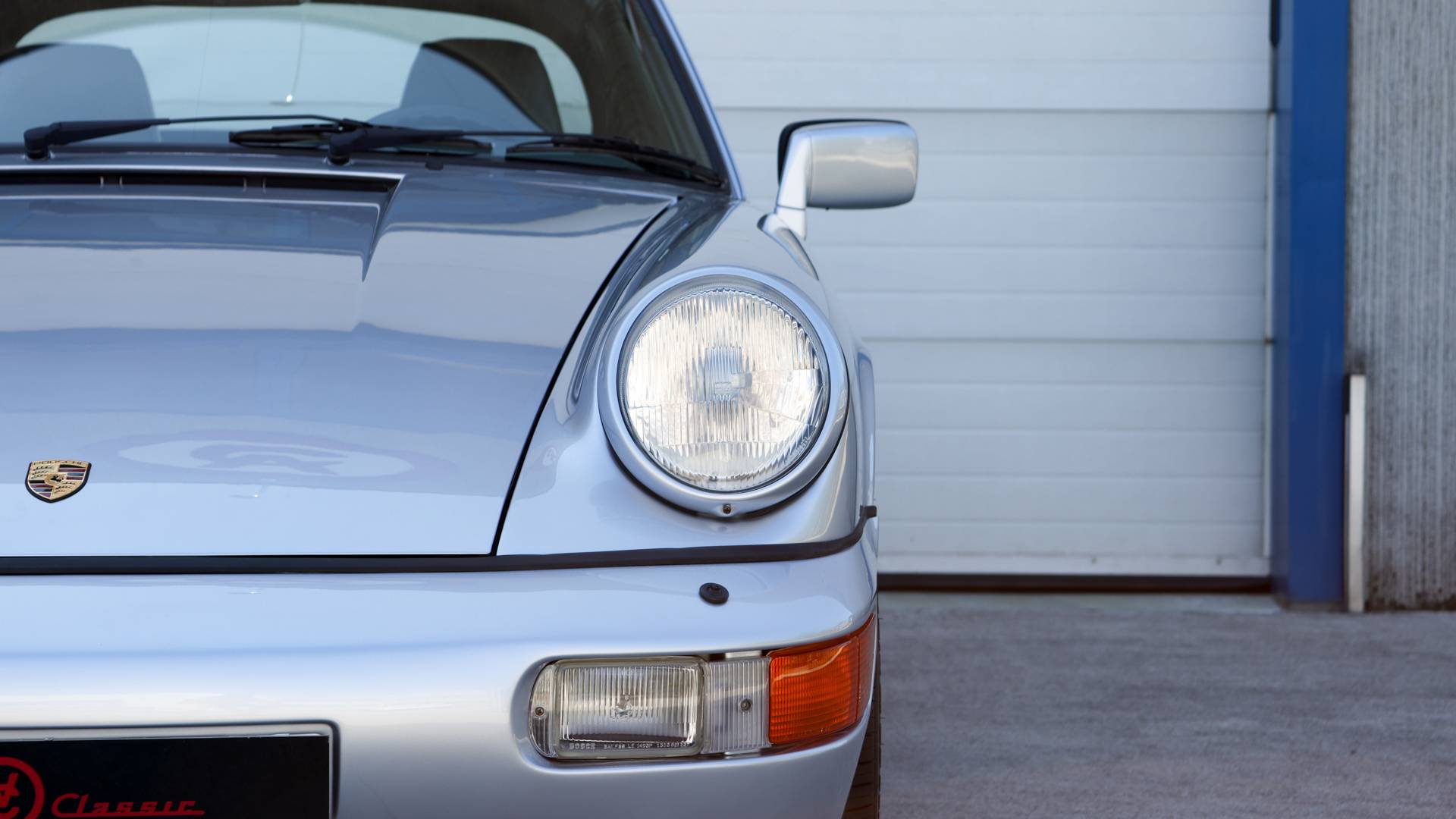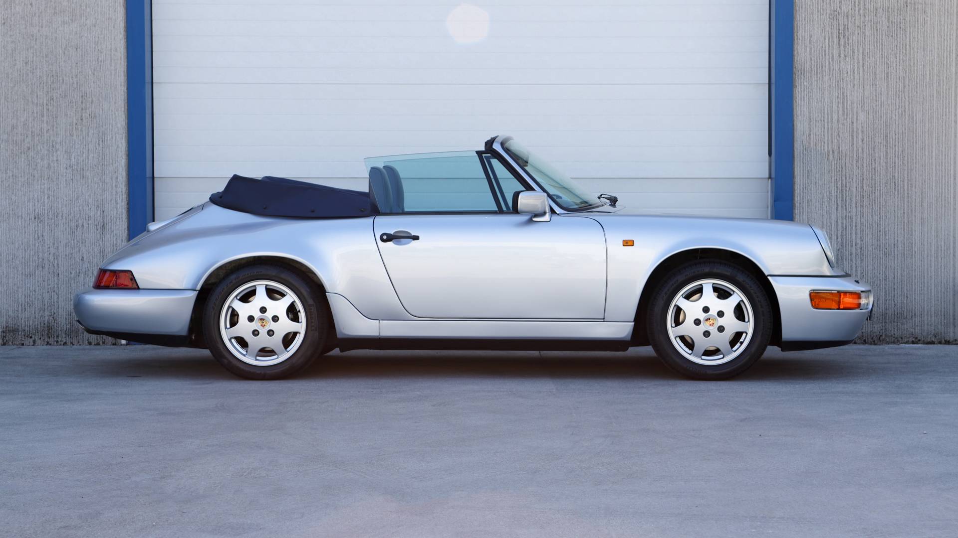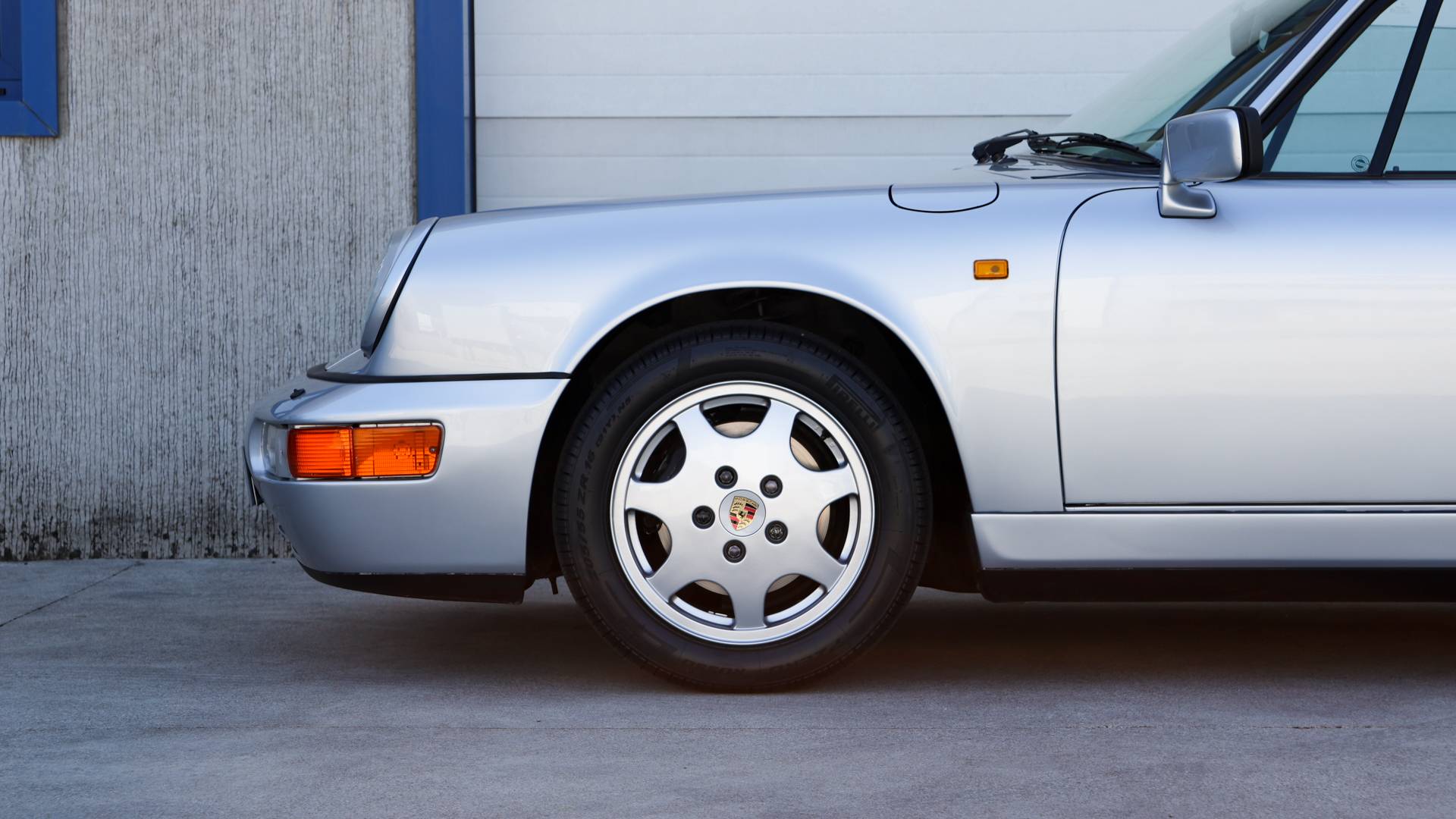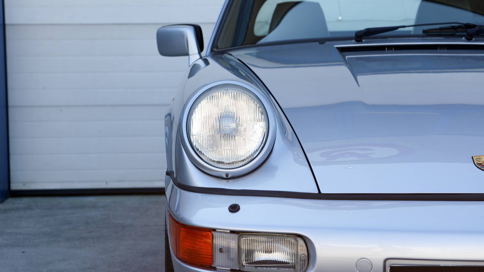 Questo esemplare è rifinito in Polarsilber Metallic (92E) con interni in pelle grigia, completati da un tetto soft-top blu. La combinazione è elegante e raffinata, e accentua perfettamente le curve sinuose e gli angoli netti della 964 Cabriolet.