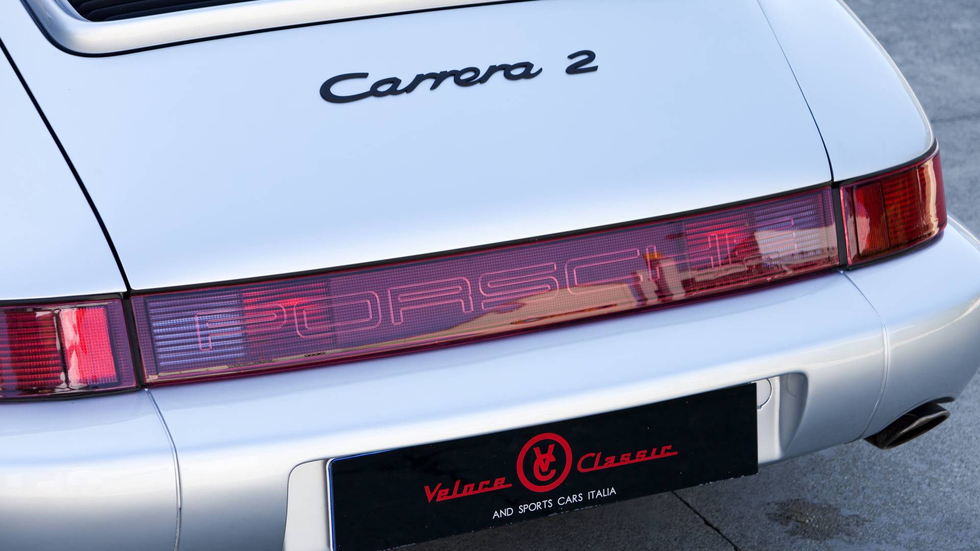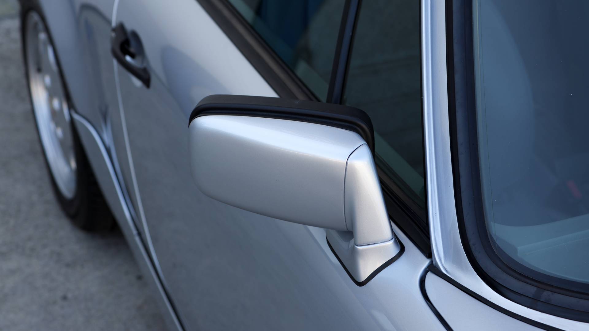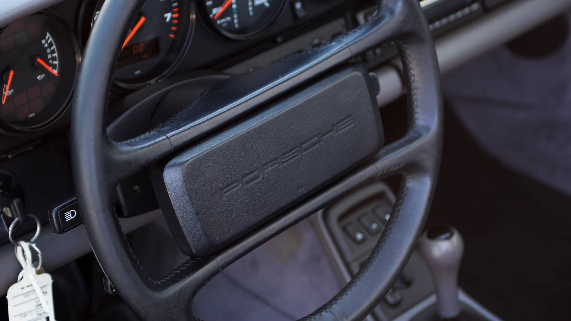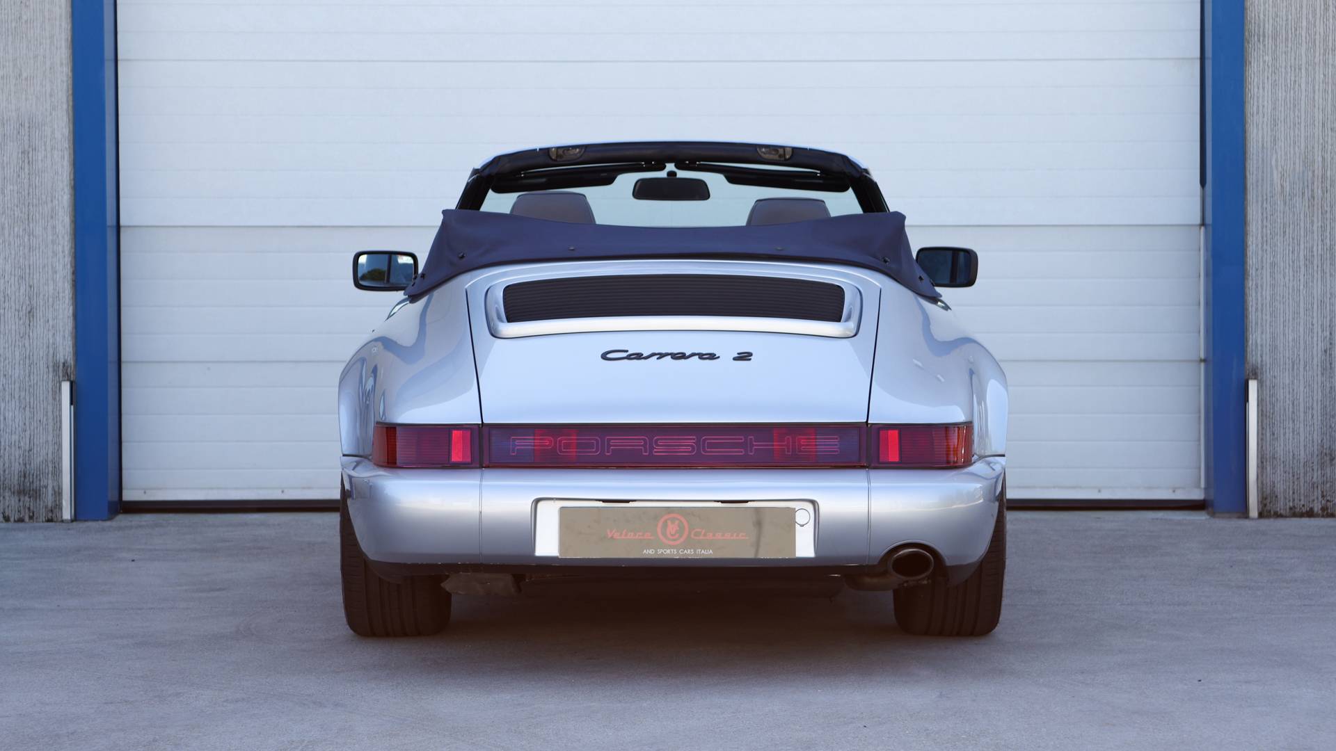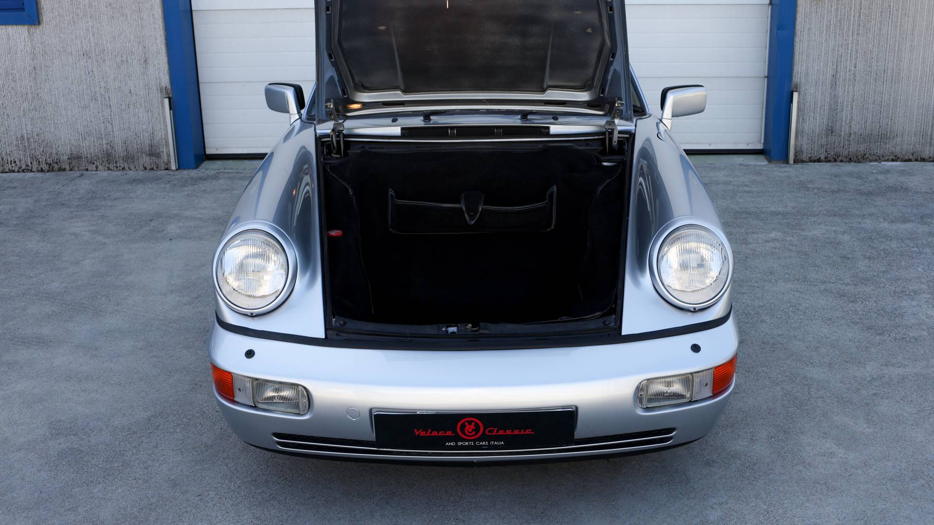 Questo esemplare è rifinito in Polarsilber Metallic (92E) con interni in pelle grigia, completati da un tetto soft-top blu. La combinazione è elegante e raffinata, e accentua perfettamente le curve sinuose e gli angoli netti della 964 Cabriolet.