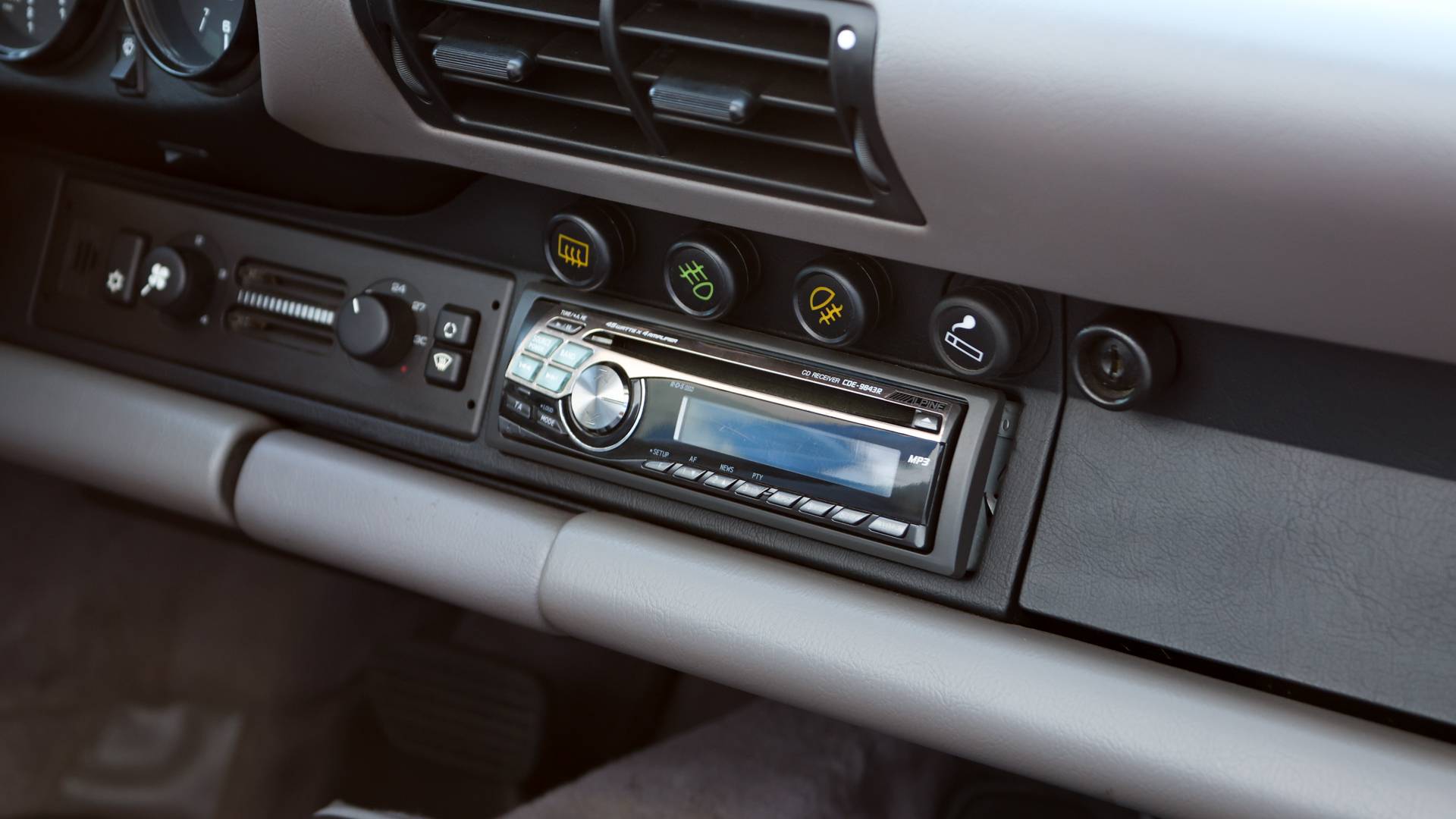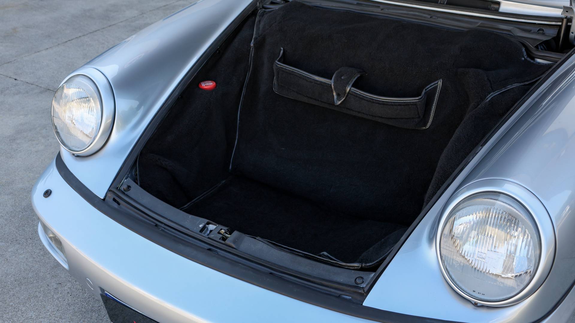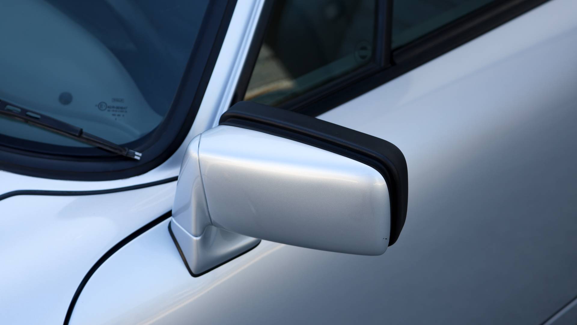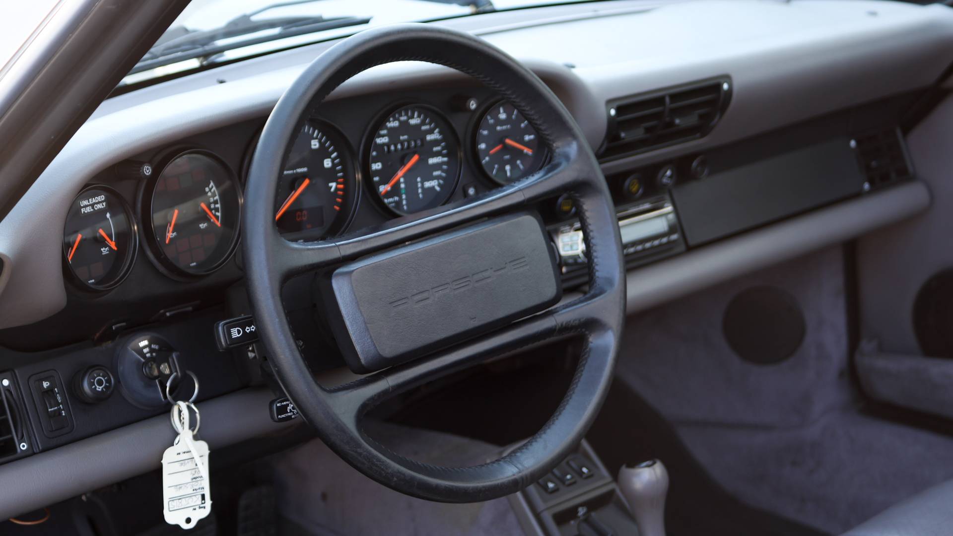Questo esemplare è rifinito in Polarsilber Metallic (92E) con interni in pelle grigia, completati da un tetto soft-top blu. La combinazione è elegante e raffinata, e accentua perfettamente le curve sinuose e gli angoli netti della 964 Cabriolet.