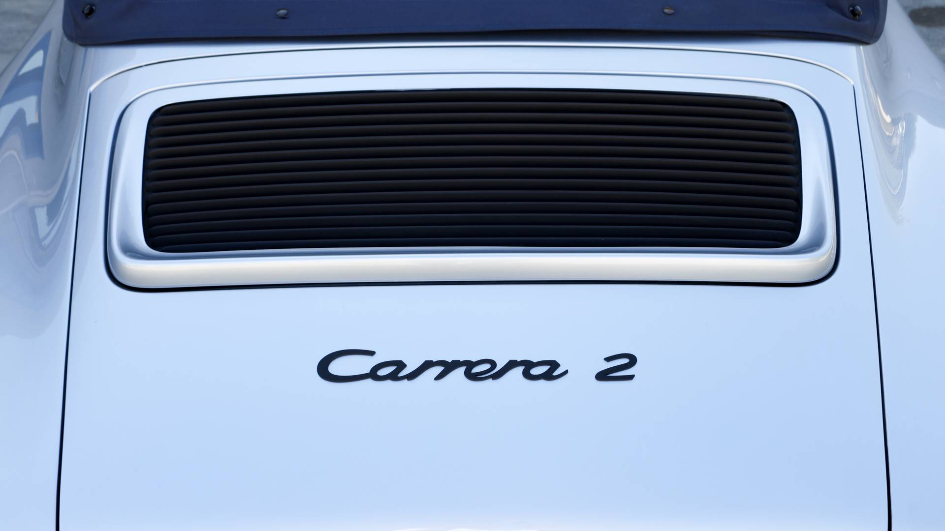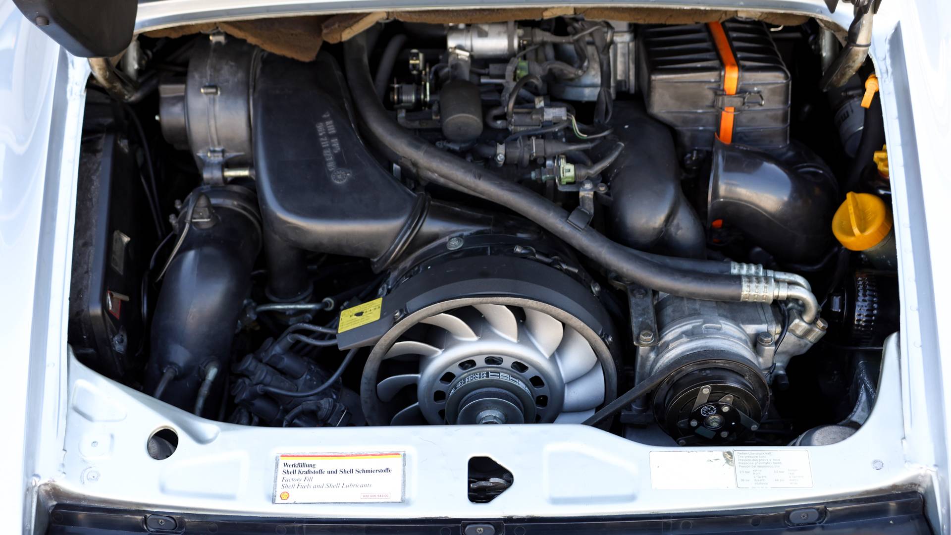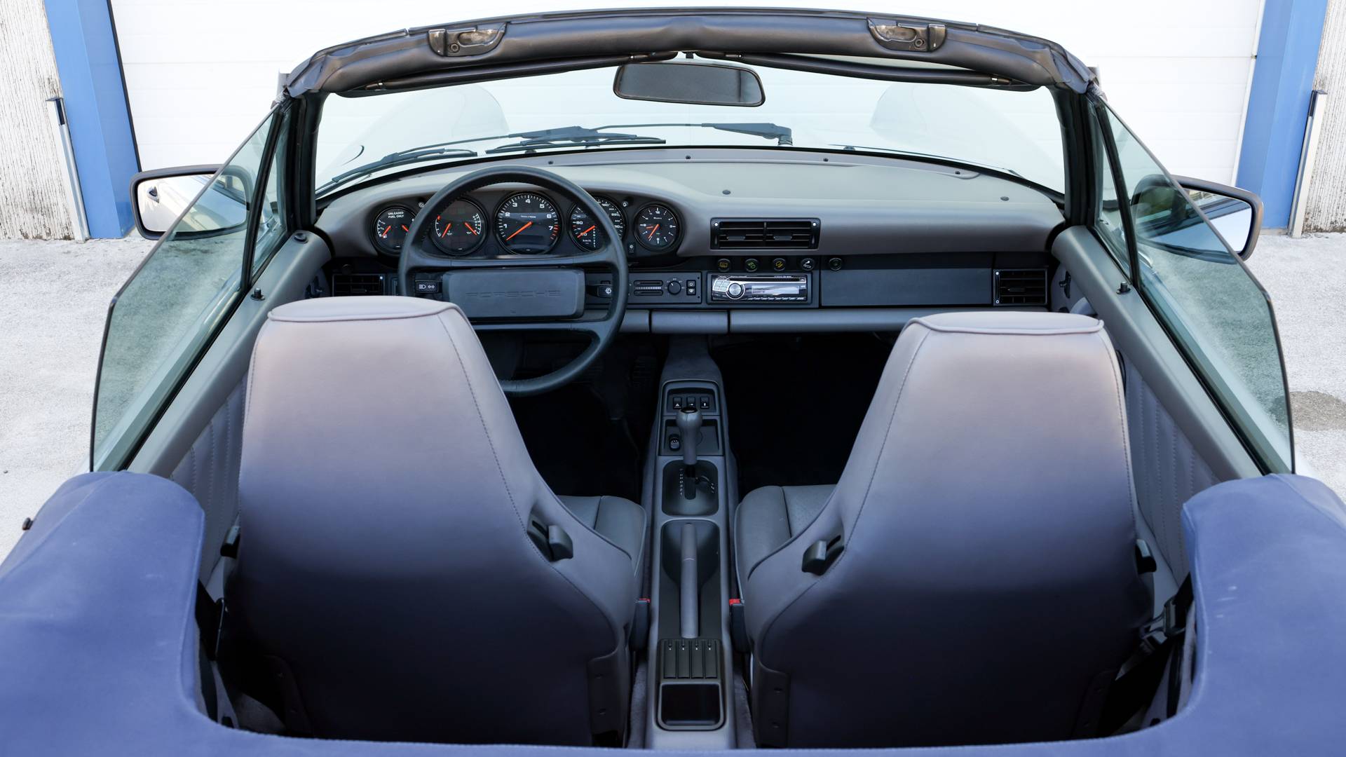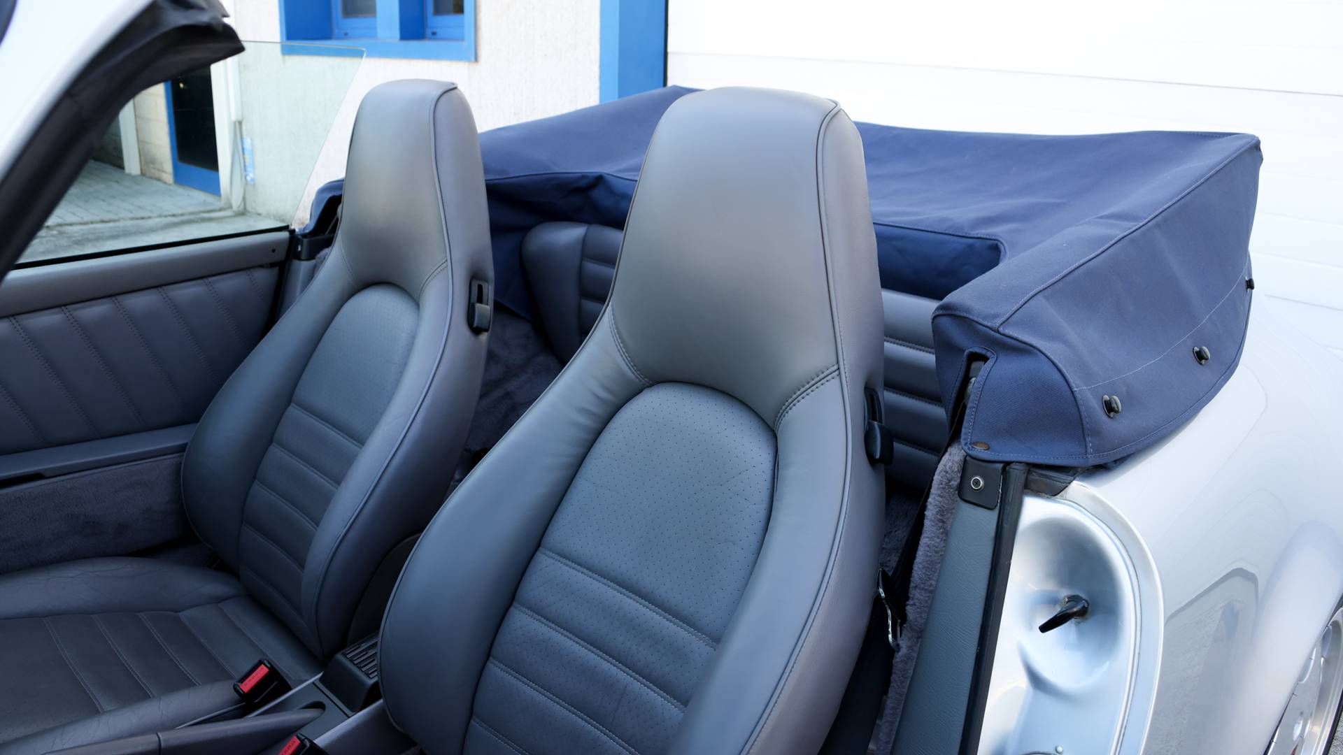 This example is finished in Polarsilber Metallic (92E) over grey leather interior, complemented by a blue soft-top roof. The combination is both classy and stylish, perfectly accentuating the elegant curves and sharp angles of the 964 Cabriolet.
